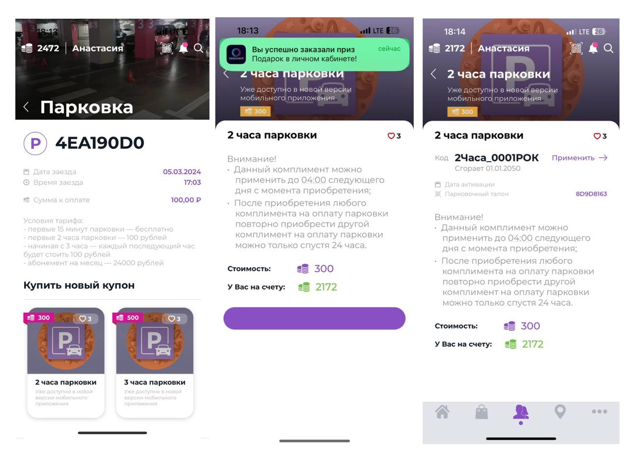 На экране приложения появится подтверждение полной оплаты либо сумма к доплате, если использованный комплимент не покрывает все часы вашей парковки.